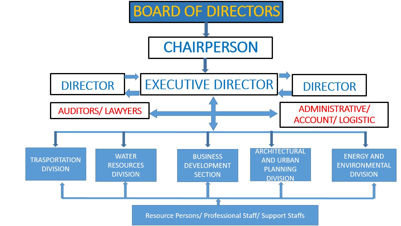 The policy and strategy of the Company is formulated by a Board of three (3) Directors. The Chairman undertakes overall management of the Company. Currently, the company has more than 25 regular Professional and administrative full time staff and over 50 part time professionals consisting of Highway Engineers, Structural Engineers, Hydrologists, Water Resources Engineers, Civil Engineers, Socioeconomists, Urban Planners, Economists, Hydropower Engineers, Trail Bridge Experts, Geo-technical Engineers, Electrical Engineers, Architects,Mechanical Engineers and Interior Designers.
